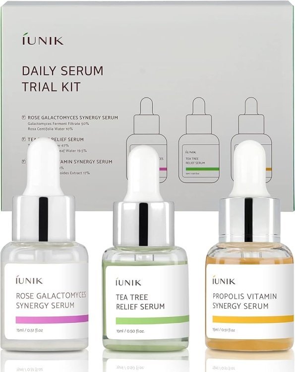 IUNIK Daily Serum Trial Kit (3x 0.51 fl.oz.) – Rose Galactomyces Synergy Serum, Tea Tree Relief Serum,Propolis Vitamin Synergy Serum, Great for Gifts, Trial, and Portability