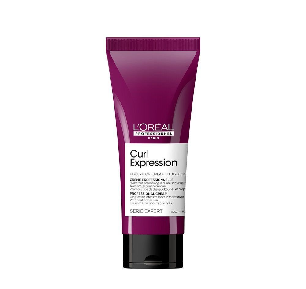 [COIFFEZ VOS BOUCLES, VERSION PROFESSIONNELLE]. Le Soin Hydratant Intensif Longue Durée sans Rinçage Curl Expression de L’Oréal Professionnel Paris est conçu pour définir les boucles et les cheveux crépus de manière professionnelle. Il hydrate intensément toutes les boucles, même les plus sèches et déshydratées, pour une chevelure durablement douce et soyeuse et 2 fois plus hydratée après 24h*. Il protège également contre la chaleur jusqu’à 230°C*. La Glycérine est un agent humectant qui attire l’eau et la retient pour une hydratation longue durée, même sur les cheveux les plus secs. L’Urea H agit à la fois sur l’hydratation et le renforcement de la barrière hydrolipidique. La graine d’Hibiscus, extraite du cœur de la fleur, est un actif naturel puissant connu pour être riche en acides aminés et en vitamines de haute qualité.